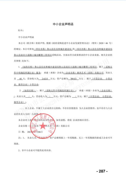 中標公告所附的中小企業(yè)聲明函顯示,睿澤藝術(深圳)有限公司從業(yè)人員45人,營業(yè)收入2.6213萬元,資產(chǎn)總額為709.83萬元。