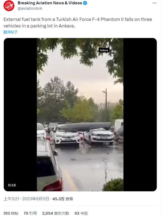 中新網9月6日電 綜合外媒報道,當?shù)貢r間9月4日,土耳其空軍一架戰(zhàn)斗機在飛行途中油箱突然掉落,砸中安卡拉市一露天停車場的汽車,所幸未造成人員傷亡。