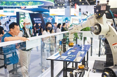 9月4日,在服貿(mào)會綜合展區(qū),參觀者正在觀看智能焊接機(jī)器人工作。