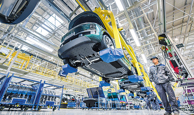 長江經(jīng)濟(jì)帶生產(chǎn)制造和出口的新能源汽車日漸成為中國出口的“金名片”。圖為一家車企江蘇常州基地的工人在加緊生產(chǎn)。