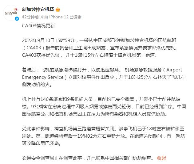 中新網(wǎng)北京9月10日電 據(jù)新加坡樟宜機(jī)場官方微博消息,2023年9月10日15時(shí)59分,一架從中國成都飛往新加坡樟宜機(jī)場的國航航班(CA403)報(bào)告前貨倉和衛(wèi)生間出現(xiàn)煙霧,宣布緊急情況并要求降落優(yōu)先權(quán)。CA403獲得優(yōu)先權(quán), 并于16時(shí)15分左右降落于樟宜機(jī)場第三跑道。