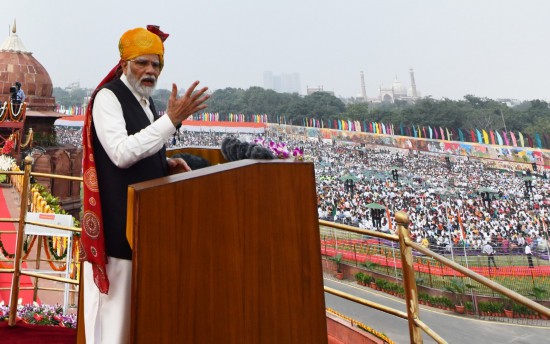 8月15日,印度總理莫迪在德里出席獨(dú)立日慶祝活動(dòng)時(shí)發(fā)表講話。新華社發(fā)
