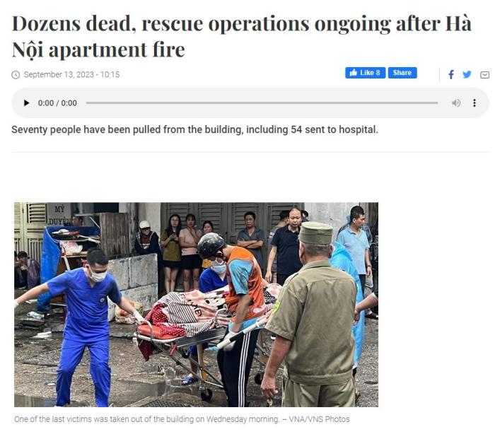 《越南新聞報(bào)》稱,目前大火已被撲滅,救援工作仍在進(jìn)行當(dāng)中。