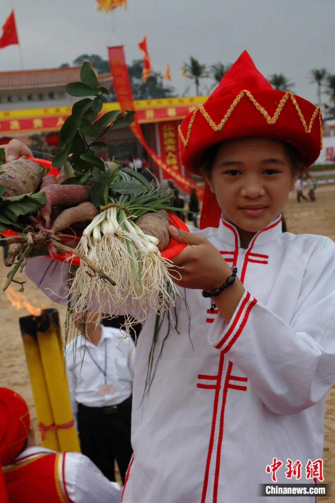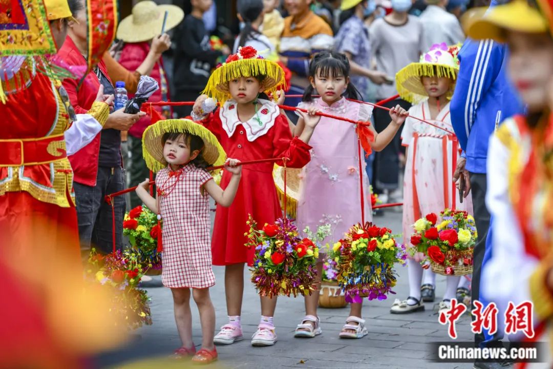 2023年2月28日,第二十二屆海口冼夫人文化節(jié)(原稱軍坡節(jié))之“裝軍巡游”活動在海南??谛缕骆?zhèn)舉行。圖為在活動中肩挑花籃的小女孩。駱云飛 攝