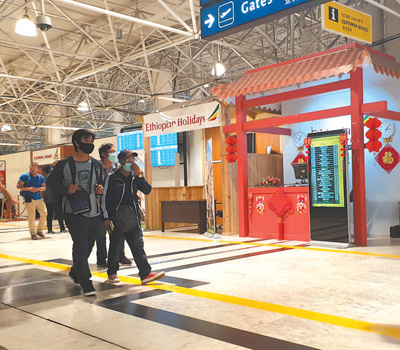 旅客經(jīng)過埃塞俄比亞博萊國(guó)際機(jī)場(chǎng)內(nèi)的中文服務(wù)臺(tái)。