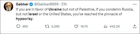 美國合眾國際社(UPI)報(bào)道注意到,有很多媒體專欄作者和社交媒體用戶都指出了西方在俄烏沖突等問題上的“虛偽行為”,佩特羅并不是唯一一位。例如一名認(rèn)證為“作家”的社交媒體用戶寫道:“如果你支持烏克蘭而不支持巴勒斯坦,如果你譴責(zé)俄羅斯卻不譴責(zé)以色列或美國,那么你就已經(jīng)達(dá)到了虛偽的頂峰。”