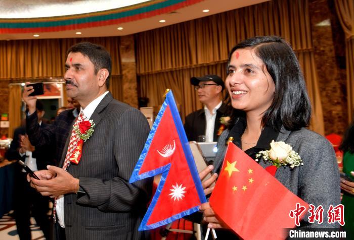 圖為10月7日,尼方人員手舉兩國國旗,載歌載舞。李林 攝