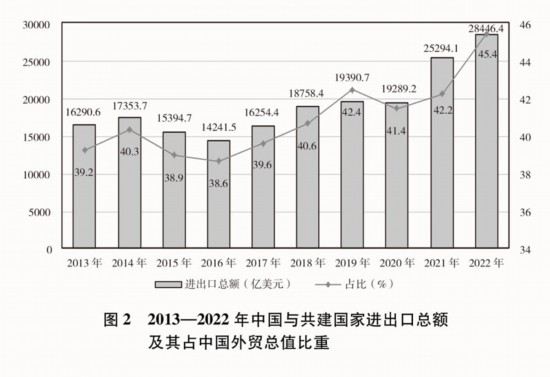 貿(mào)易投資規(guī)模穩(wěn)步擴(kuò)大。2013-2022年,中國與共建國家進(jìn)出口總額累計19.1萬億美元,年均增長6.4%;與共建國家雙向投資累計超過3800億美元,其中中國對外直接投資超過2400億美元;中國在共建國家承包工程新簽合同額、完成營業(yè)額累計分別達(dá)到2萬億美元、1.3萬億美元。2022年,中國與共建國家進(jìn)出口總額近2.9萬億美元,占同期中國外貿(mào)總值的45.4%,較2013年提高了6.2個百分點(diǎn);中國民營企業(yè)對共建國家進(jìn)出口總額超過1.5萬億美元,占同期中國與共建國家進(jìn)出口總額的53.7%。