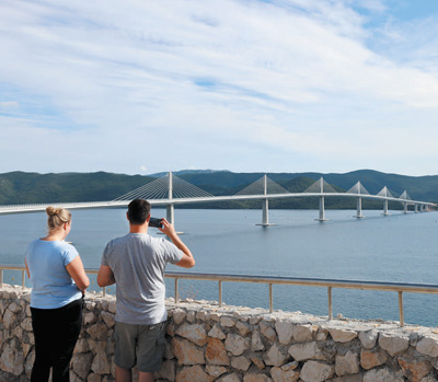沿著克羅地亞狹長的海岸線一路向南行駛到科馬爾納地區(qū),遠(yuǎn)遠(yuǎn)就能望見如銀鏈般橫臥在山海之間的佩列沙茨大橋。在橋頭一側(cè)的休息區(qū),人們紛紛停下車來,對著大橋拍照留念。來自克羅地亞北部的卡塞爾和朋友們特地自駕來到這里,開心地請本報記者幫忙合影。“佩列沙茨大橋連通了克羅地亞南北領(lǐng)土,是我們心中最美的大橋!”卡塞爾說。