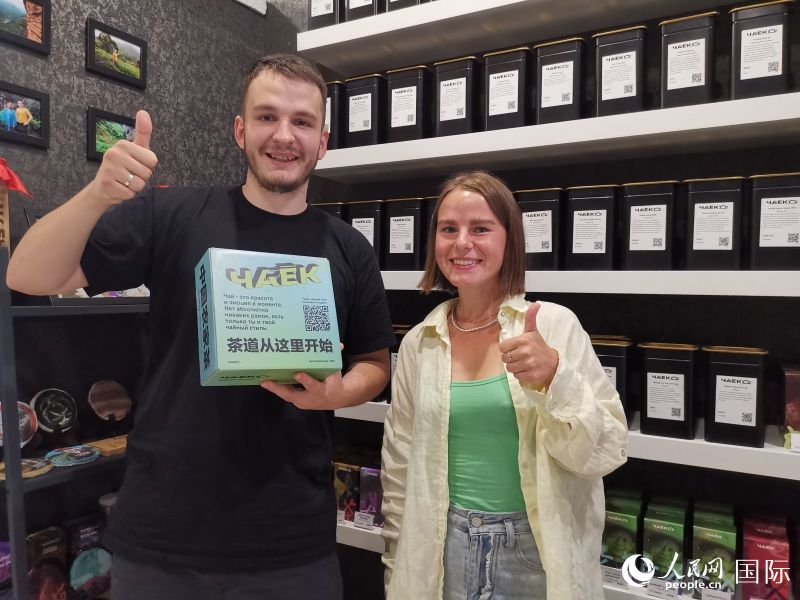 馬克西姆和妻子達麗婭在圣彼得堡茶葉店內(nèi)展示產(chǎn)品。人民網(wǎng)記者 楊倩攝