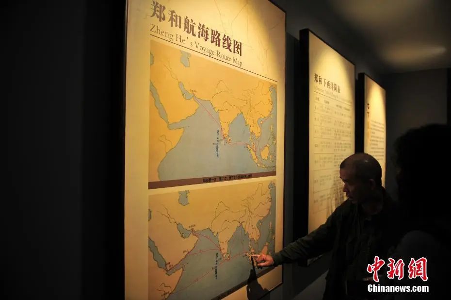 圖為觀眾在鄭和紀(jì)念館內(nèi)觀看鄭和航海線路圖。中新社記者 劉冉陽(yáng) 攝