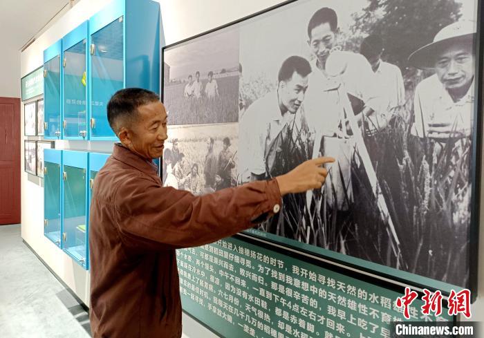 10月13日,在安江農(nóng)校紀(jì)念園內(nèi)的雜交水稻發(fā)源地紀(jì)念館,袁隆平的學(xué)生宋澤觀講述袁隆平及其團(tuán)隊研究雜交水稻的故事。中新社記者 鄧霞 攝