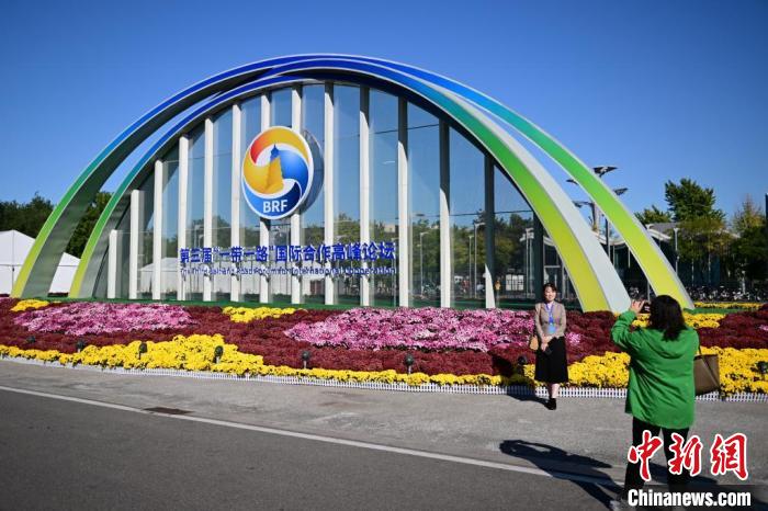 10月15日,北京,工作人員在國(guó)家會(huì)議中心外的第三屆“一帶一路”國(guó)際合作高峰論壇景觀布置前拍照留念。當(dāng)日,位于國(guó)家會(huì)議中心的第三屆“一帶一路”國(guó)際合作高峰論壇新聞中心啟動(dòng)試運(yùn)行?!≈行律缬浾?田雨昊 攝