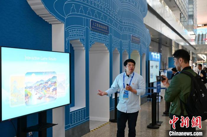 10月15日,北京,工作人員為媒體記者介紹人工智能繪畫(huà)體驗(yàn)項(xiàng)目。當(dāng)日,位于國(guó)家會(huì)議中心的第三屆“一帶一路”國(guó)際合作高峰論壇新聞中心啟動(dòng)試運(yùn)行。 中新社記者 田雨昊 攝
