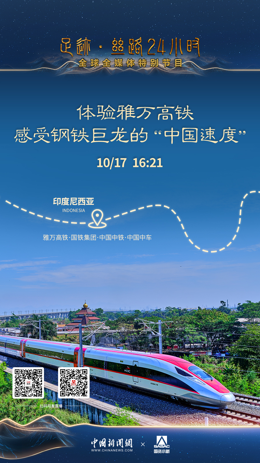 雅萬高鐵連接印尼首都雅加達(dá)和第四大城市萬隆,全長142公里,設(shè)計(jì)最高時(shí)速350公里。 “足跡·絲路24小時(shí)”全球全媒體特別節(jié)目實(shí)地探訪和體驗(yàn)這條“鋼鐵巨龍”。