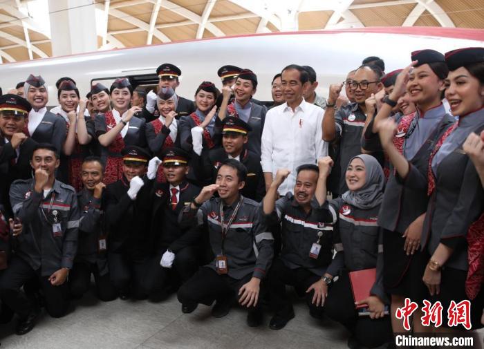 9月13日,印度尼西亞總統(tǒng)佐科考察中印尼合作項目雅萬高鐵,并在哈利姆站乘坐G5901次高鐵列車赴帕達拉朗站。這是他首次乘坐雅萬高鐵。圖為佐科在哈利姆站與乘務人員合影。 中新社記者 李志全 攝