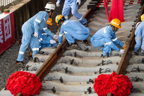 3月31日,在印度尼西亞雅加達(dá)雅萬高鐵哈利姆車站,工人鋪設(shè)雅萬高鐵全線最后一根鋼軌。