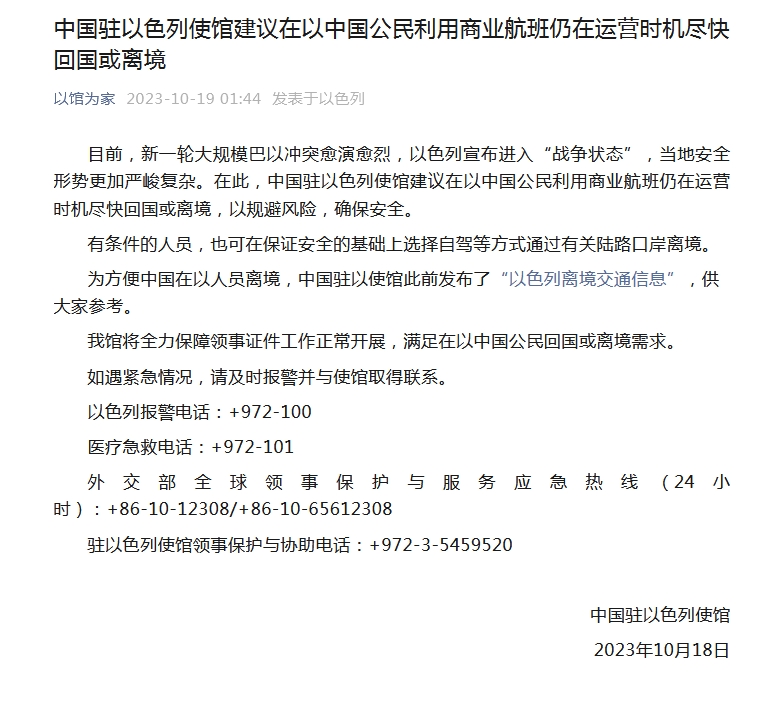 為方便中國在以人員離境,中國駐以使館此前發(fā)布了“以色列離境交通信息”。中國駐以使館將全力保障領(lǐng)事證件工作正常開展,滿足在以中國公民回國或離境需求。