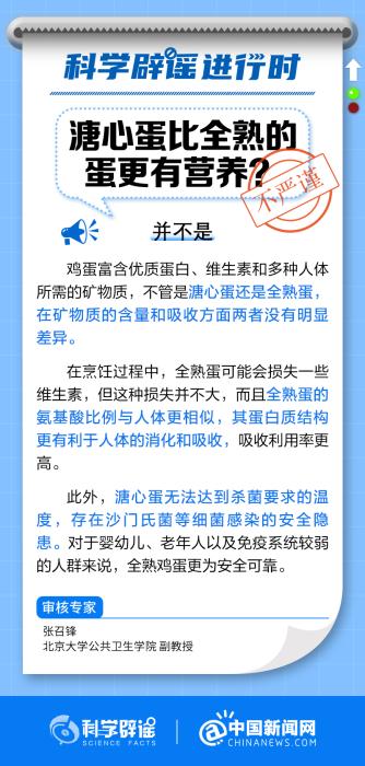 中新網(wǎng)10月20日電 溏心蛋和全熟蛋在礦物質(zhì)的含量和吸收方面沒有明顯差異。在烹飪過程中,全熟蛋可能會損失一些維生素,但這種損失并不大,而且全熟蛋的氨基酸比例與人體更相似,其蛋白質(zhì)結(jié)構(gòu)更有利于人體的消化和吸收。此外,溏心蛋無法達到殺菌要求的溫度,存在沙門氏菌等細菌感染的安全隱患。(來源:@科學(xué)辟謠 @中國新聞網(wǎng) )