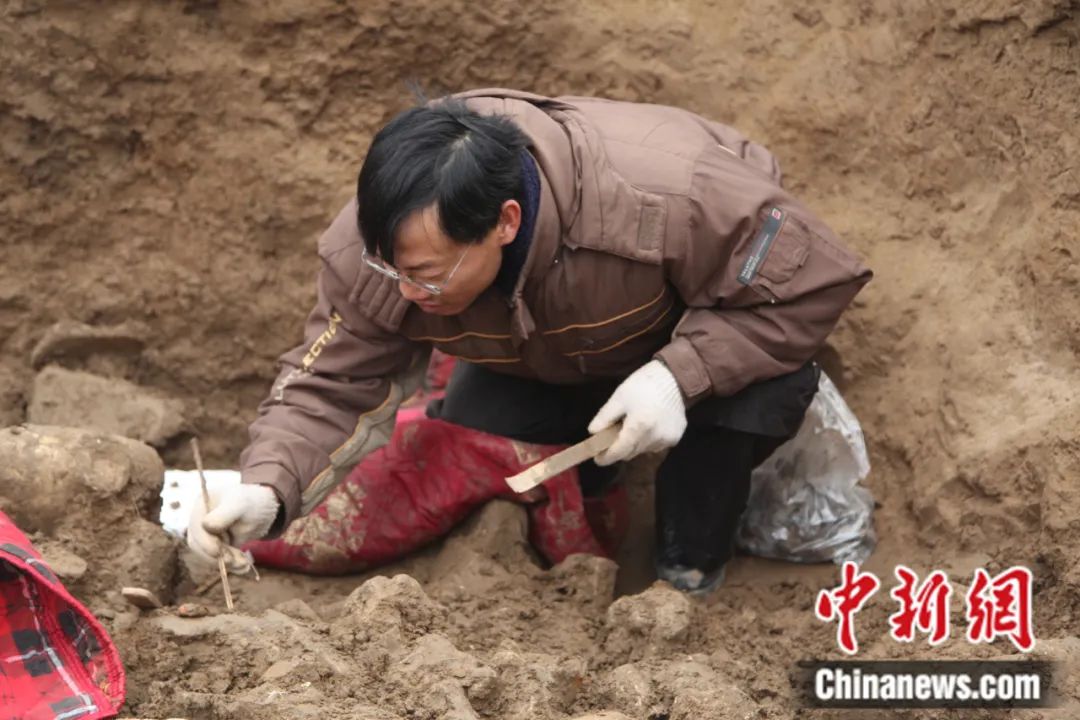 何利群在鄴城遺址東郭區(qū)佛教造像埋藏坑遺跡進行現(xiàn)場發(fā)掘。鄴城考古隊供圖