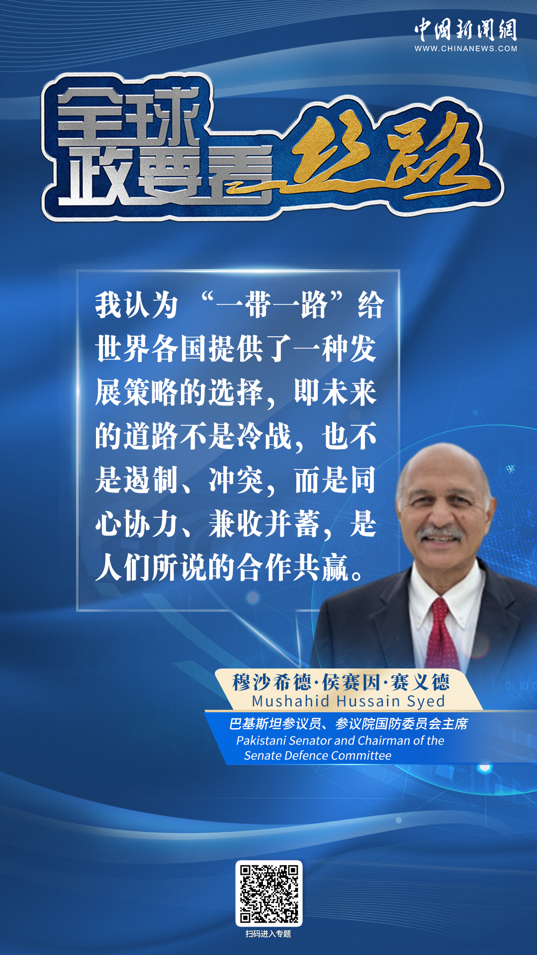 中新網(wǎng)10月28日電(張乃月) “‘一帶一路’給世界各國提供了一種發(fā)展策略的選擇,即未來的道路不是冷戰(zhàn),也不是遏制、沖突,而是同心協(xié)力、兼收并蓄,是人們所說的合作共贏?!卑突固箙⒆h員、參議院國防委員會主席穆沙希德·侯賽因·賽義德近日接受中新網(wǎng)專訪時如是說。