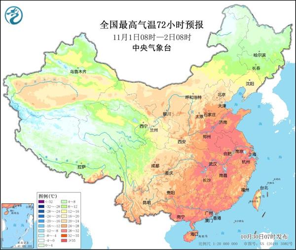 本周前期,中東部升溫還將繼續(xù)。 預計本周初,全國大部仍會以升溫為主,并且大幅偏離常態(tài)。特別是華北、黃淮一帶,11月初暖熱程度還會升級,部分地區(qū)最高氣溫甚至會超過30℃部分,比如,鄭州,菏澤等地可能在11月1日前后迎來當地11月觀測史上的首個30℃。