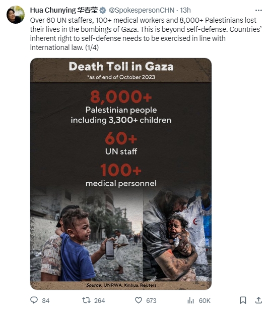 據報道,當天,華春瑩發(fā)帖提及加沙地帶的人員傷亡。她稱,“超過60名聯(lián)合國工作人員、100名醫(yī)務工作者、8000名巴勒斯坦人在對加沙的轟炸中喪生。這超出了自衛(wèi)的范圍。各國擁有的自衛(wèi)權須依據國際法行使?!?/p>