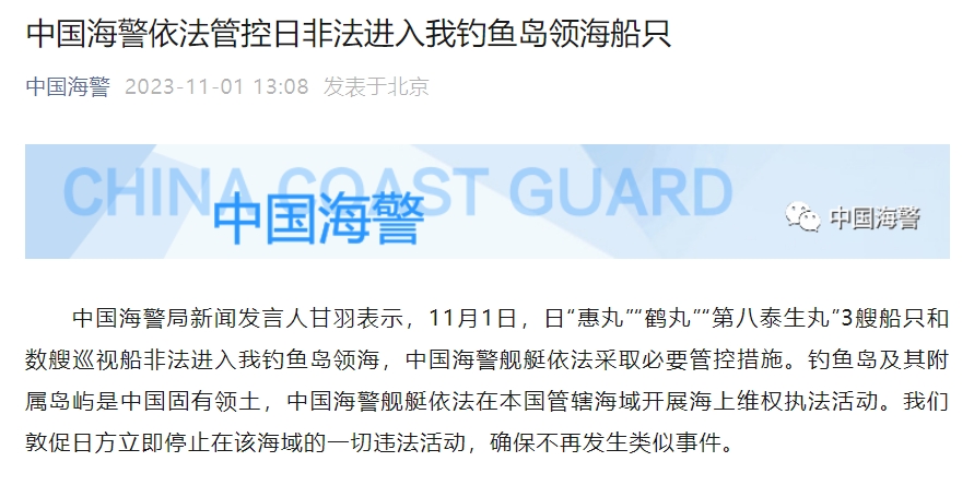 中新網(wǎng)11月1日電 據(jù)中國海警微博消息,中國海警局新聞發(fā)言人甘羽表示,11月1日,日“惠丸”“鶴丸”“第八泰生丸”3艘船只和數(shù)艘巡視船非法進入我釣魚島領(lǐng)海,中國海警艦艇依法采取必要管控措施。釣魚島及其附屬島嶼是中國固有領(lǐng)土,中國海警艦艇依法在本國管轄海域開展海上維權(quán)執(zhí)法活動。我們敦促日方立即停止在該海域的一切違法活動,確保不再發(fā)生類似事件。