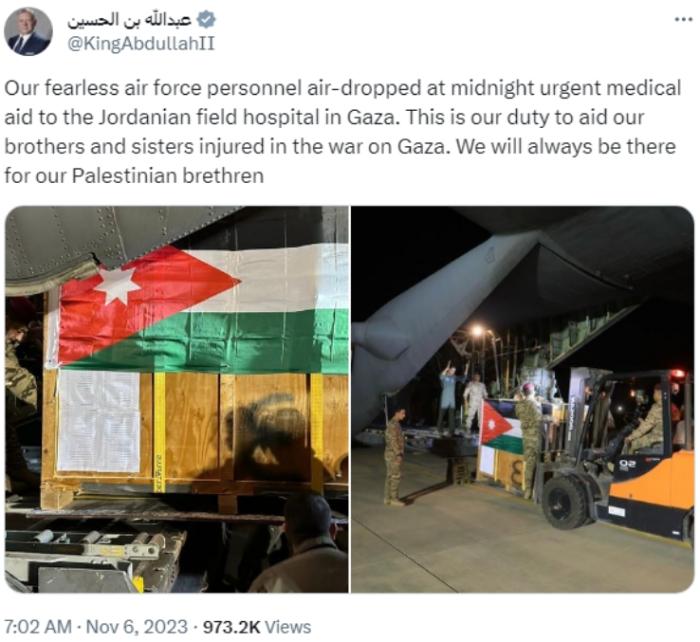 中新網(wǎng)11月6日電 當(dāng)?shù)貢r(shí)間6日,約旦國王阿卜杜拉二世在社交媒體發(fā)文稱,約旦空軍在6日午夜時(shí)分向加沙的約旦野戰(zhàn)醫(yī)院空投了緊急醫(yī)療援助物資。