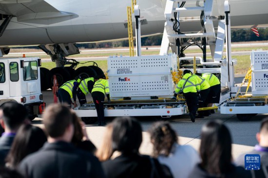 11月8日,在美國弗吉尼亞州的華盛頓杜勒斯國際機場,裝有大熊貓的特制“旅行包廂”運上專機。新華社記者劉杰攝