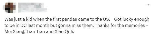 有網(wǎng)友回憶起與大熊貓的點滴時說,“當(dāng)?shù)谝慌笮茇垈儊淼矫绹鴷r,我還只是個孩子。上個月很幸運能前往華盛頓,我會想念它們的。謝謝你們帶來的回憶——美香、添添和小奇跡?!?/p>