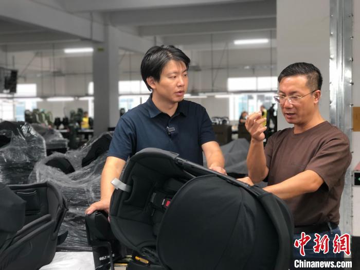 10月17日,臺灣青年楊博弘(左一)在惠州工廠詢問嬰童安全座椅生產(chǎn)情況。中新社記者 孫秋霞 攝