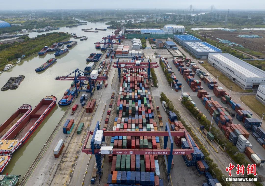 2023年10月7日,京杭大運(yùn)河江蘇省淮安市新港集裝箱碼頭一派忙碌景象。賀敬華 攝