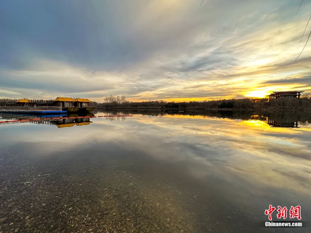 2022年12月11日,夕陽(yáng)映照大運(yùn)河,北京通州大運(yùn)河森林公園里落日余暉映晚霞,一抹夕陽(yáng)美如畫。王丹楓 攝