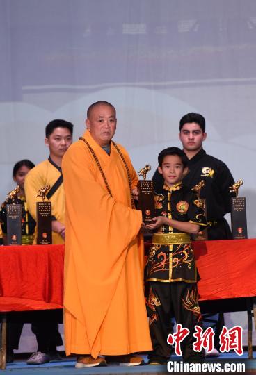 當(dāng)?shù)貢r間11月12日下午,由中國嵩山少林寺主辦的“不朽少林”少林功夫公演在已有逾百年歷史的美國洛杉磯Million Dollar劇院舉行。圖為嵩山少林寺方丈釋永信向“北美洲少林考功大賽”獲獎?wù)哳C獎。 中新社記者 張朔 攝