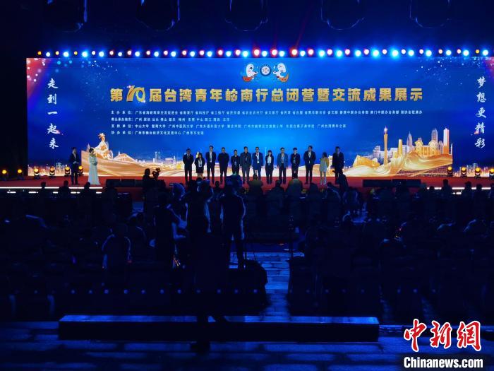 在第十屆臺(tái)灣青年嶺南行總閉營儀式上,臺(tái)灣社團(tuán)和港澳社團(tuán)青年代表登臺(tái)送上對(duì)嶺南行活動(dòng)十周年的美好祝福。郭軍 攝