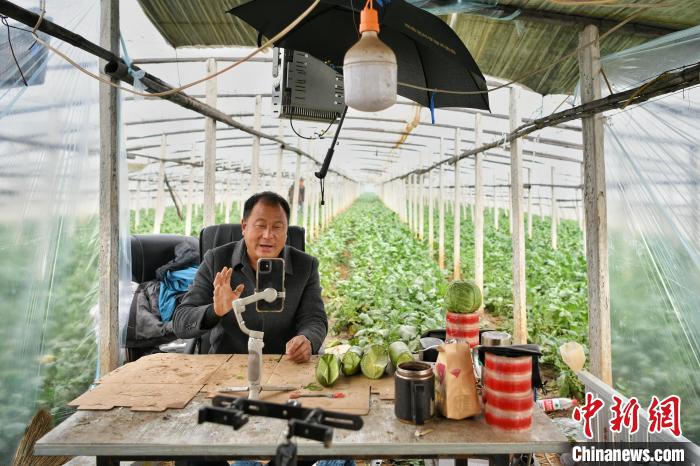 11月18日,在天津市西青區(qū)辛口鎮(zhèn)種植沙窩蘿卜的大棚內(nèi),農(nóng)民郭芝振通過手機直播推介沙窩蘿卜?!≈行律缬浾?佟郁 攝