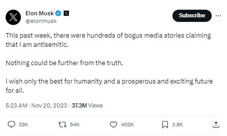 據(jù)報(bào)道,馬斯克在社交媒體平臺(tái)X上寫道,“過(guò)去一周,有數(shù)百個(gè)虛假的媒體報(bào)道聲稱我是反猶太主義者。事實(shí)并非如此。我只希望人類一切都好,所有人都有一個(gè)繁榮和令人興奮的未來(lái)。”