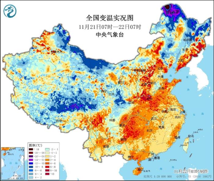 中新網(wǎng)11月22日電 據(jù)中央氣象臺網(wǎng)站消息,今晨,中東部大部地區(qū)仍有不同程度的回暖,但這也將是本輪寒潮過程來前最后的溫暖。目前冷空氣已經(jīng)開始影響黑龍江西北部,漠河今晨氣溫達到-27.3℃,比昨日同時刻降低20℃。中央氣象臺今晨繼續(xù)發(fā)布寒潮、暴雪、大風三個預警。其中,未來24小時,內(nèi)蒙古東部、黑龍江中東部將有大范圍強降雪,需要特別小心!