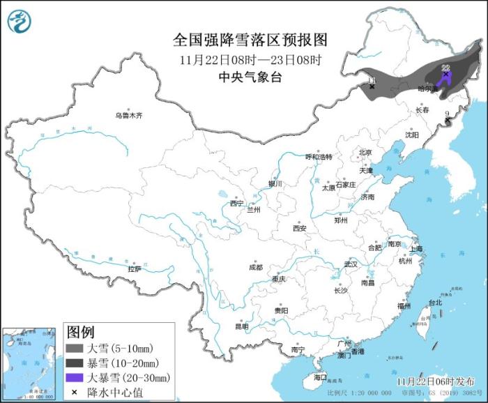 暴雪黃色預警:預計,11月22日08時至11月23日08時,內(nèi)蒙古東部、黑龍江中東部、吉林北部和長白山區(qū)等地的部分地區(qū)有大到暴雪,其中,黑龍江中部局地有大暴雪(20~22毫米);上述地區(qū)新增積雪深度6~12厘米,局地可達16厘米以上。
