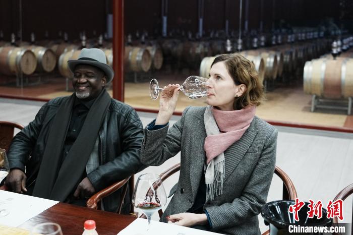 德國駐華大使館食品與農(nóng)業(yè)參贊鄧菲(右)品鑒寧夏葡萄酒。中新網(wǎng)記者 崔楠 攝