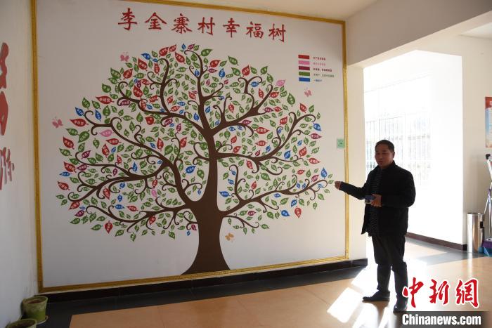 在李金寨村村委一面墻上,一棵高達(dá)3米的彩繪“幸福樹(shù)”引人注目。