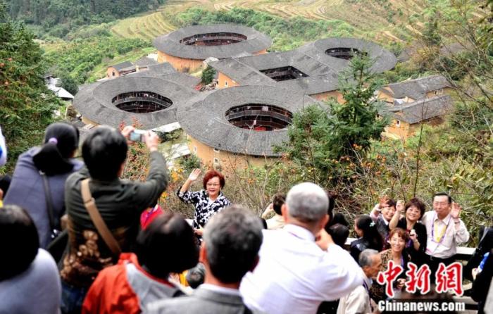 2011年,來(lái)自世界五大洲三十多個(gè)國(guó)家和地區(qū)的海內(nèi)外華人作家、學(xué)者,參加完在廣州舉辦的世界華文文學(xué)研討會(huì)后,來(lái)到福建漳州,參觀南靖土樓群。王東明 攝