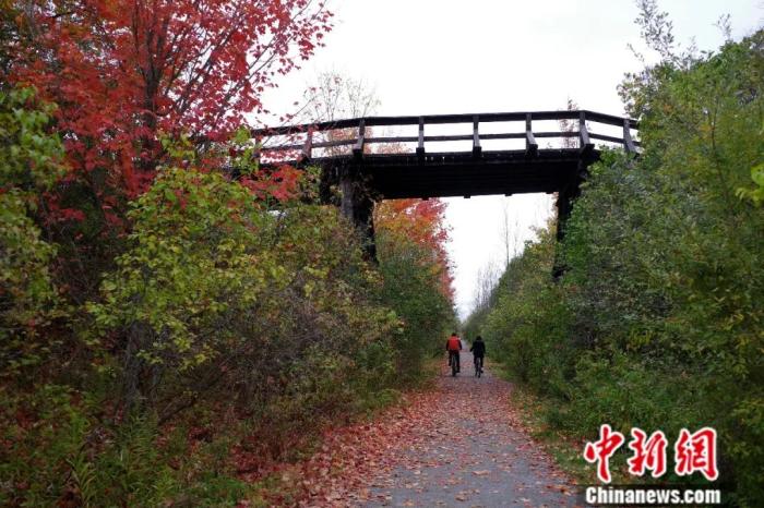 加拿大大多倫多地區(qū)以東的卡沃薩湖市(Kawartha Lakes),市民在一條充滿秋意的棧道騎行休閑。余瑞冬 攝