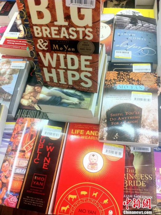 2012年10月21日,莫言的《豐乳肥臀》《酒國(guó)》等多部作品英文版正在紐約一家書店上架出售,每本書的封面都印有“2012年諾貝爾文學(xué)獎(jiǎng)獲得者”字樣。李洋 攝