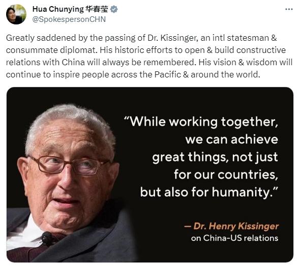華春瑩寫道,“我對基辛格博士的逝世深感悲痛,他是一位國際政治家和杰出的外交家。我們將永遠銘記他為開拓和建立同中國的建設(shè)性關(guān)系所作的歷史性努力。他的遠見和智慧將繼續(xù)激勵太平洋地區(qū)乃至世界各地的人們?!?/p>