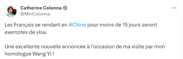 法國外長科隆納也表示:“我的同事王毅在我訪問之際宣布了一個很棒的消息!前往中國停留不超過15天的法國人將免簽?!?/p>