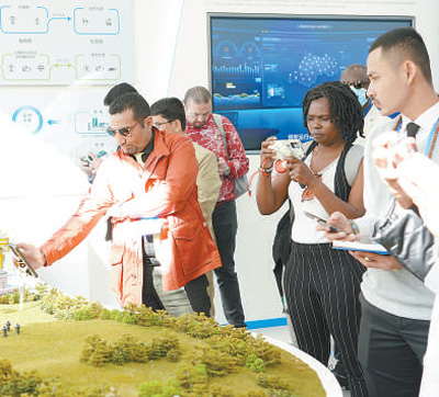 2023“一帶一路”媒體合作論壇聯(lián)合采訪團成員參觀中國能建數(shù)字化展廳。