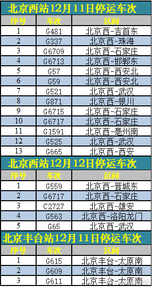 12月11日、12月12日北京西站、北京豐臺(tái)站部分列車停運(yùn)