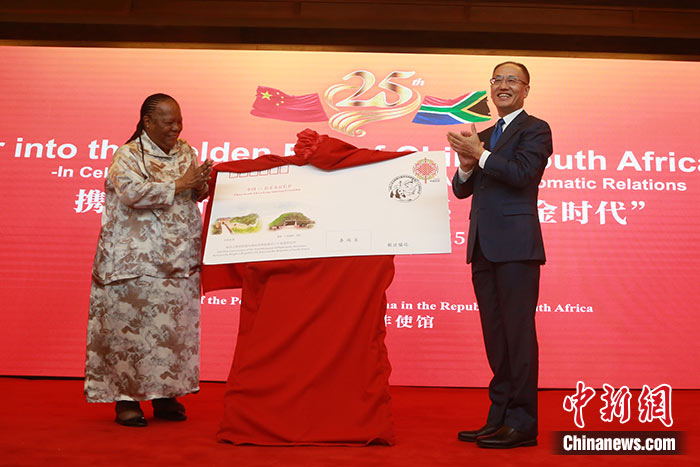 當?shù)貢r間12月12日,中國駐南非大使館隆重舉行慶祝中國和南非建交25周年招待會。圖為中國駐南非大使陳曉東同南非外長潘多爾為中南建交25周年紀念封揭幕。 中新社記者 王曦 攝